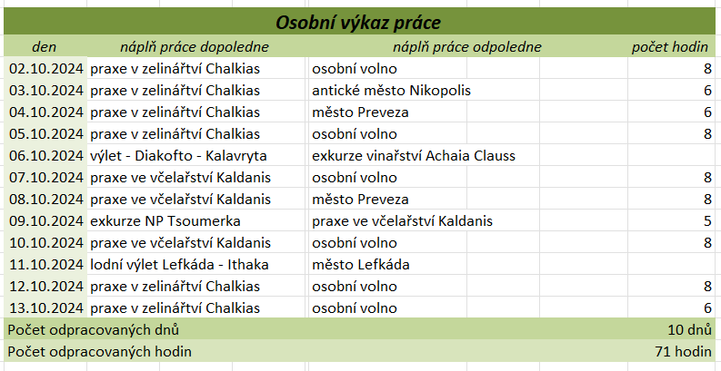Tato praxe se mi opravdu moc líbila. Jsem rád, že jsem se mohl do Řecka znovu podívat a zároveň si vyzkoušet nové věci, které bych si doma běžně nevyzkoušel. Nejvíce mě zaujala práce u včel – bylo to pro mě něco úplně nového a velmi zajímavého. Nikdy předtím jsem u včel ani ve stáčírně medu nebyl, a proto jsem si tuto zkušenost opravdu užil. Majitelé včelařství i jejich zaměstnanci byli velmi přátelští a příjemní. A nesmím zapomenout zmínit paní, která nám ve včelařství připravovala výborné svačiny – to bylo milé a hezky domácí. Také sběr oliv byl pro mě novou zkušeností. Byla to fyzicky náročnější práce, ale líbila se mi a jsem rád, že jsem si ji mohl vyzkoušet na vlastní kůži. Velkým přínosem pro mě byly i výlety. Navštívili jsme místa, na kterých jsem nikdy předtím nebyl, a měl jsem možnost poznat krásy řecké přírody i místní kultury. Oceňuji i to, že jsme měli prostor na poznávání měst a každodenního života v jiné zemi – bylo zajímavé pozorovat rozdíly oproti tomu, na co jsme zvyklí doma. Velmi mi vyhovovalo i to, že jsme měli volný čas na sport a odpočinek – například možnost hrát volejbal nebo se jít vykoupat do moře. Celkově byla organizace času a domluva na srazech zvládnutá velmi dobře a nevznikaly zbytečné zmatky. Praxe ve sklenících byla sice zajímavá, ale přiznávám, že mě tolik nenadchla, protože tento typ práce je dostupný i u nás. Přesto jsem rád, že jsem si ji mohl vyzkoušet v jiném prostředí. Tato stáž mě obohatila v mnoha ohledech – nejvíce asi tím, že jsem měl možnost strávit delší dobu v cizí zemi, poznat místní životní styl a jinou kulturu. Největší dojem na mě udělaly výlety a – co se týče pracovní části – rozhodně práce ve včelařství. Jsem opravdu vděčný, že jsem se mohl této praxe zúčastnit. Děkuji za tuto zkušenost.