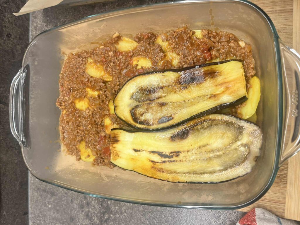 - Skládání: Do zapékací mísy vrstvi lilek, maso, opět lilek a navrch bešamel.