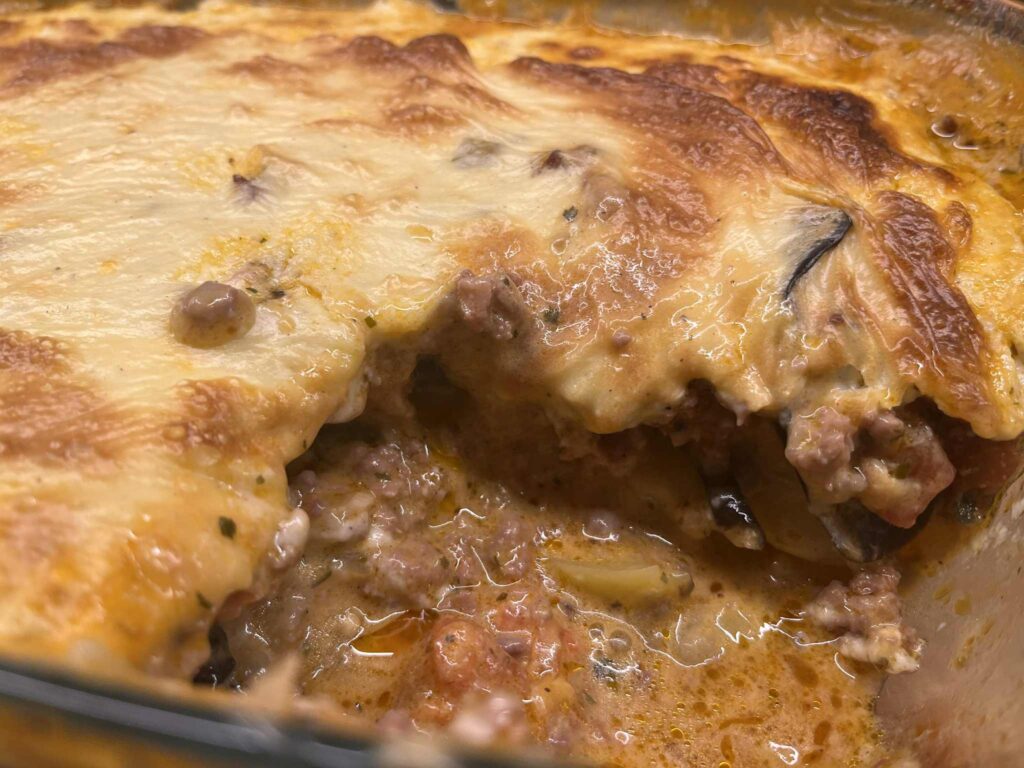 - Tradiční musaka s lilkem, mletým jehněčím a bešamelem