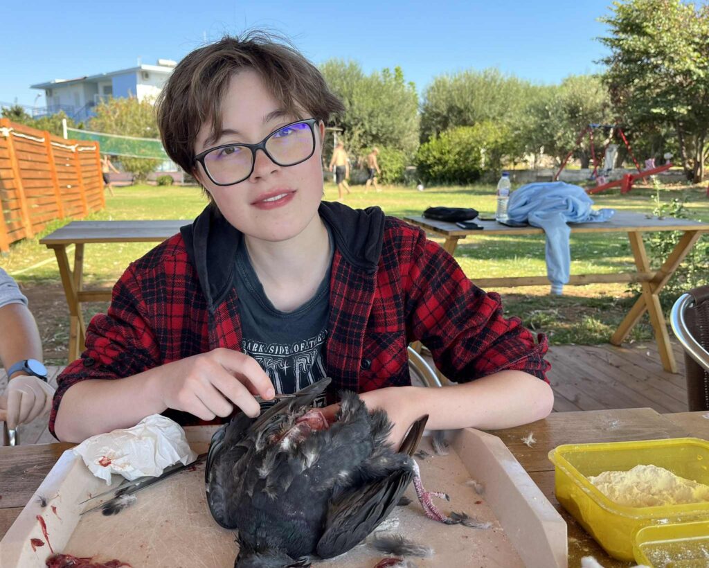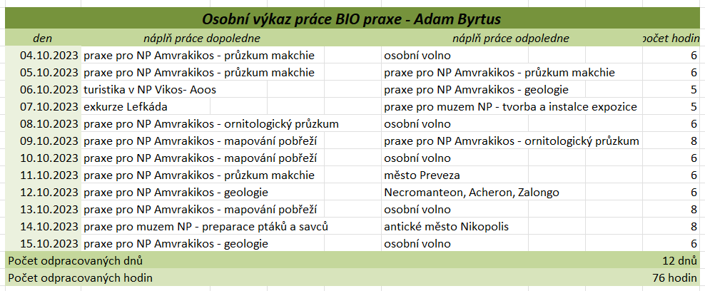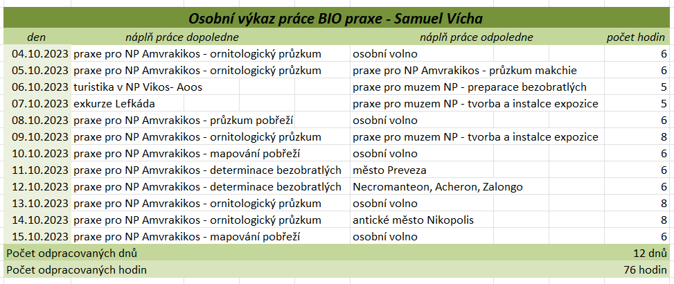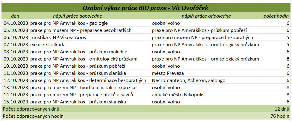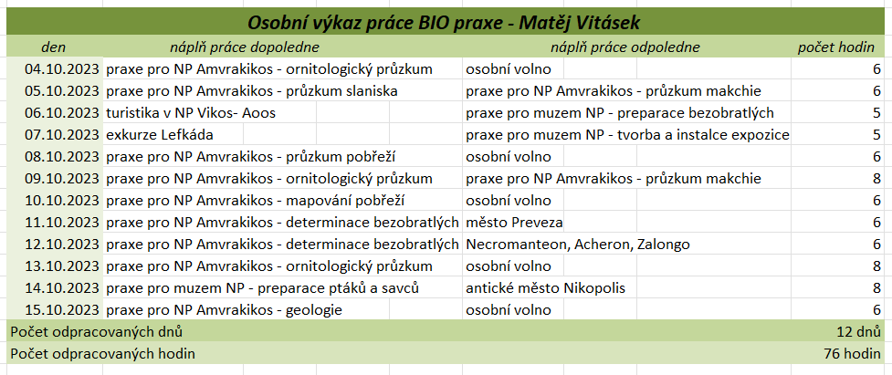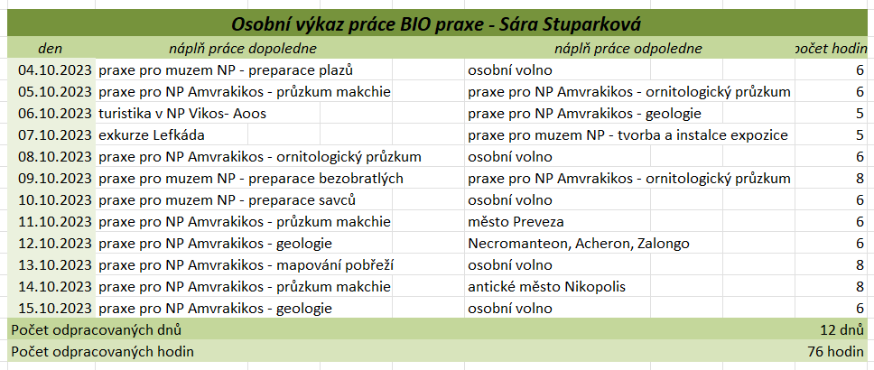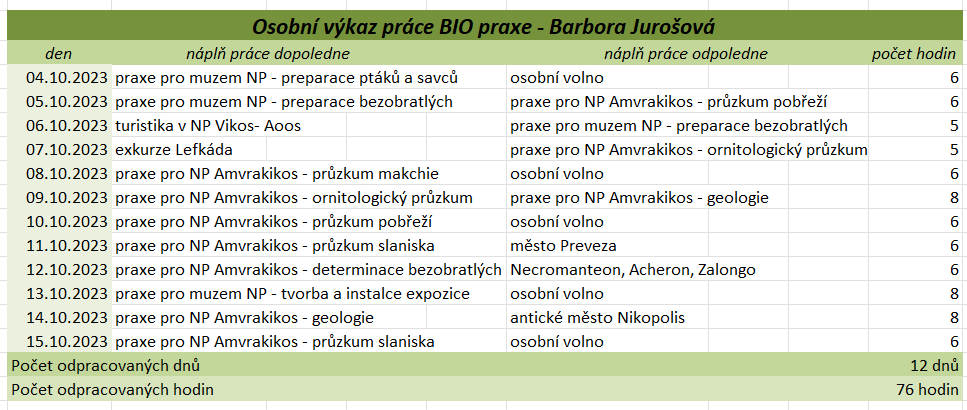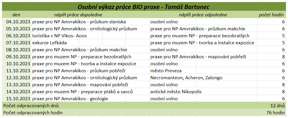 Tato praxe nám přinesla mnoho cenných zkušeností a poznatků, jak odborných, tak i osobních. Díky ní jsme si rozšířili znalosti v rámci našich studijních oborů, ale i mimo ně, zejména v oblasti rozdělení rostlin a živočichů a ekologických vztahů v přírodě. Velkým přínosem byla možnost vyzkoušet si praktické dovednosti, jako je preparace živočichů, včetně zpracování kostí, která nás velmi zaujala a motivovala k dalšímu rozvoji v této oblasti. Zaujalo nás také terénní sbírání a určování motýlů, bezobratlých, rostlin a mušlí, stejně jako poznávání různých typů vegetace přímo v jejich přirozeném prostředí. Významnou součástí praxe byly i celodenní výlety, během kterých jsme měli příležitost poznat pestré přírodní scenérie od mořského pobřeží po horské oblasti. Kromě odborných aktivit jsme měli možnost lépe poznat i řeckou kulturu, místní tradice, gastronomii a každodenní život obyvatel. Velmi jsme ocenili také možnost navazovat nová přátelství a sdílet zážitky s ostatními účastníky i odborníky, kteří nás během praxe vedli a motivovali. Tato zkušenost nám rozšířila obzory, zvýšila náš zájem o další vzdělávání a mnozí z nás by se do Řecka rádi v budoucnu vrátili – nejen kvůli jedinečné přírodě, ale i kvůli lidem a dalším možnostem poznávání. Když jsme odjížděli, nevěděli jsme, co nás tam čeká a co všechno se nového dozvíme. Teď, když se blížíme ke konci a odjíždíme domů, nás to hodně mrzí, protože se nám tam opravdu líbilo a mnoho jsme se naučili. Chápeme, že pro někoho nemusí být sbírání brouků, pozorování přírody nebo objevování zvláštních květin s paní Jane zrovna to pravé, ale pro nás to bylo fascinující. A panem Stratem Floudasem jsme si uvědomili, že práce nemusí být nuda, ale může to být i zábava. Za nás bylo skvělé poznávat přírodu, kulturu a tradice všemi smysly. Od preparace brouků, poznávání místních rostlin, objevování chutí balkánské kuchyně až po vyzkoušení tradičních tanců. Možná jsme čekali, že praxe bude spíš formální a plná teorie, ale naopak – učili jsme se neustále v terénu, poznávali různá prostředí a objevovali rozmanitou faunu i flóru. Tyto zkušenosti byly nejen vzdělávací, ale také velmi inspirující. Chtěli bychom, aby tato praxe trvala déle – těch 14 dní uteklo hrozně rychle, i když jsme se dozvěděli mnoho nového o Řecku. Hodně nás to posunulo i v našem výzkumu na závěrečnou práci. Poznali jsme spoustu milých lidí, kteří byli vždy ochotni pomoci a na které se můžeme kdykoliv obrátit. Utvrdili jsme se v tom, že chceme nadále pokračovat ve studiu a práci zaměřené na přírodu. Chtěli bychom také poděkovat všem, kteří se o nás během praxe starali. Paní učitelce Válečkové za péči a podporu, panu učiteli Válečkovi za ochotu kdykoliv pomoci, Ještě jednou děkujeme za tuto příležitost a za vše, co jsme díky Erasmus+ mohli zažít.