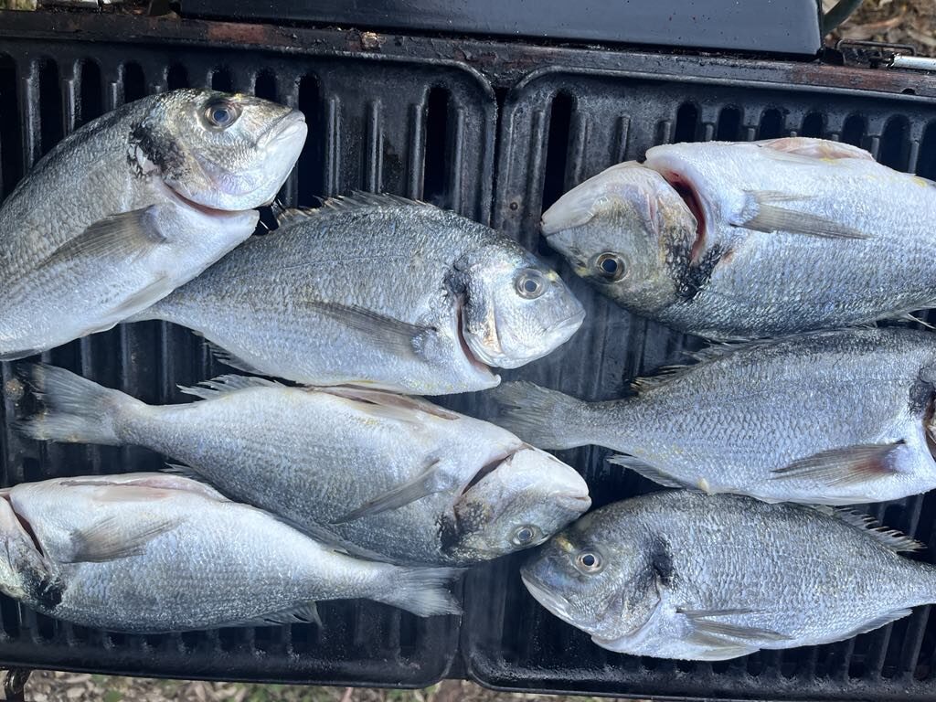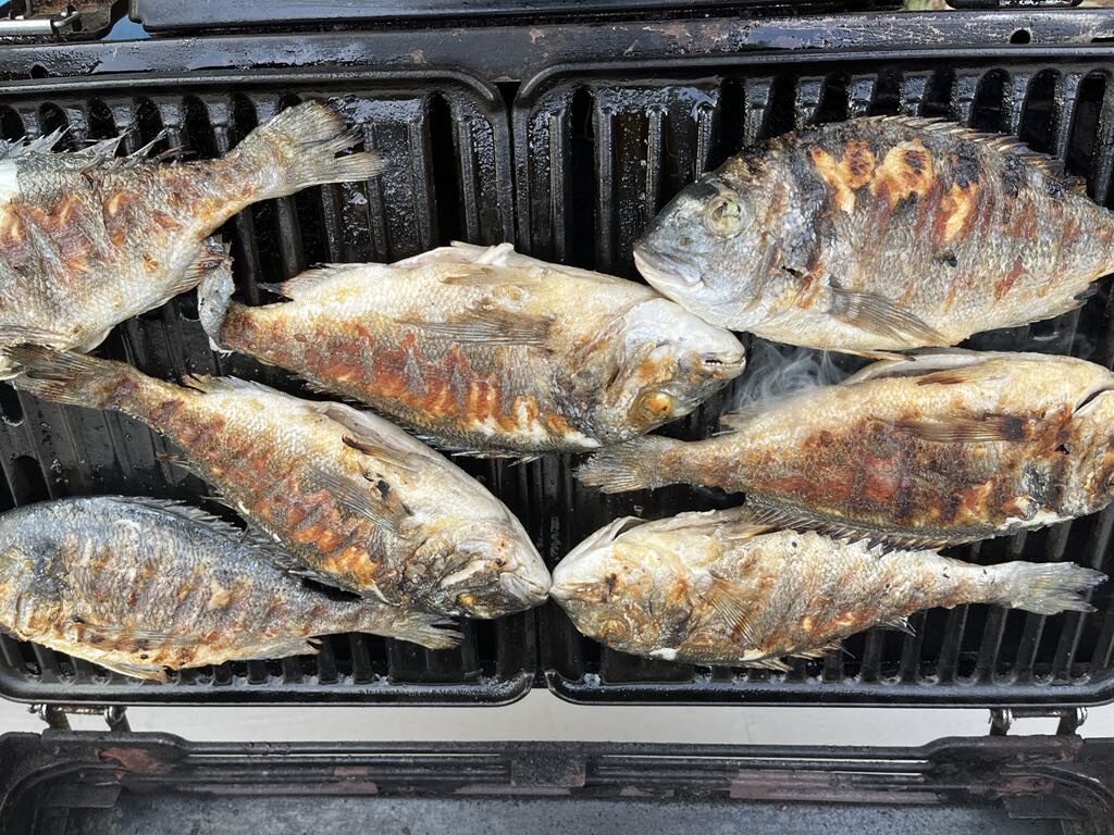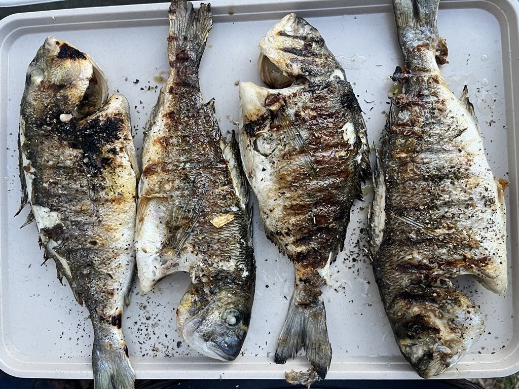 Podáváme s čerstvými citronovými klínky a oblíbenou přílohou – například grilovanou cuketou, paprikou, bramborami nebo focacciou. Rybu důkladně očistíme, osušíme a na bocích několikrát nařízneme nožem (mělké zářezy). Osolíme a opepříme zvenku i uvnitř. Do dutiny vložíme plátky citronu, nasekaný česnek a několik snítek čerstvých bylinek. Celou rybu pokapeme olivovým olejem a necháme 15–30 minut odpočinout (ideálně v lednici). Mezitím si připravíme gril – rošt lehce potřeme olejem, aby se ryba nepřichytávala. Gril by měl být středně rozpálený. Rybu grilujeme cca 5–6 minut z každé strany, dokud není kůže křupavá a maso se snadno odděluje od kostí. Po sundání z grilu necháme rybu chvilku odpočinout, pak ozdobíme jarní cibulkou a bylinkami.