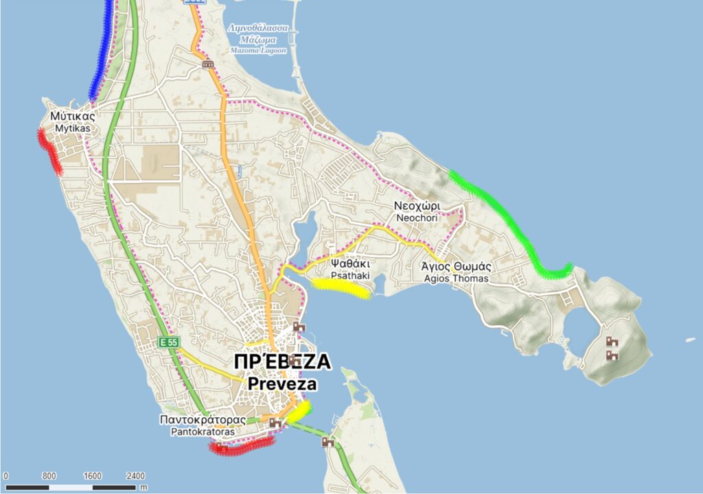 🔵Monolithi🟡 Prevezská pláž 🔴 Pantokrator a Mytikas🟢Agii Apostoli a Neochori